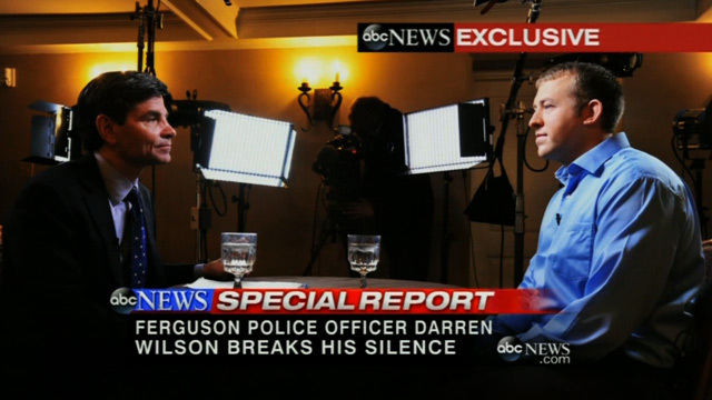 Wilson sat down with ABC's George Stephanopoulos Tuesday and gave his version of events -- that Brown reached into Wilson's patrol car and attempted to grab his gun, and Brown then charged Wilson which is when he began shooting.