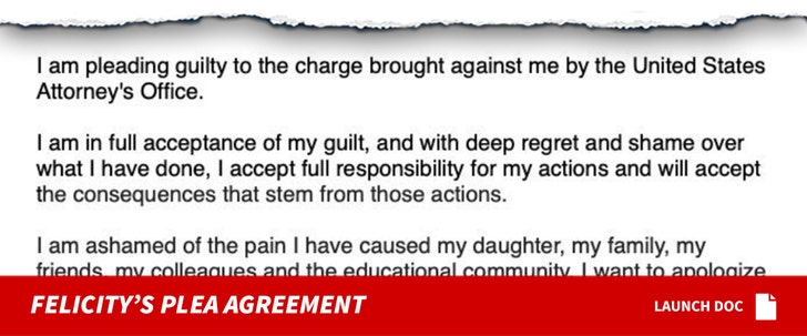 As we reported, Felicity copped a plea Monday, along with 12 other parents. The remaining 37 individuals charged -- including Lori and her husband, Mossimo Giannulli -- have been offered plea deals, with varying recommendations for prison sentences, largely determined by the amount they paid in bribes and whether they accept responsibility for what they did.